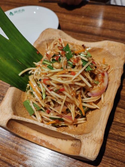 舂木瓜的统一制作方法是以新鲜木瓜为主料,放入石臼中,加入基诺自制酸笋、小米辣、香柳、青柠等多种香料手工舂制而成。 味浓而鲜,鲜中带辣,基诺一带还再加磨碎的花生碎,使味道多了醇厚少了涩,享誉基诺山与西双版纳各地