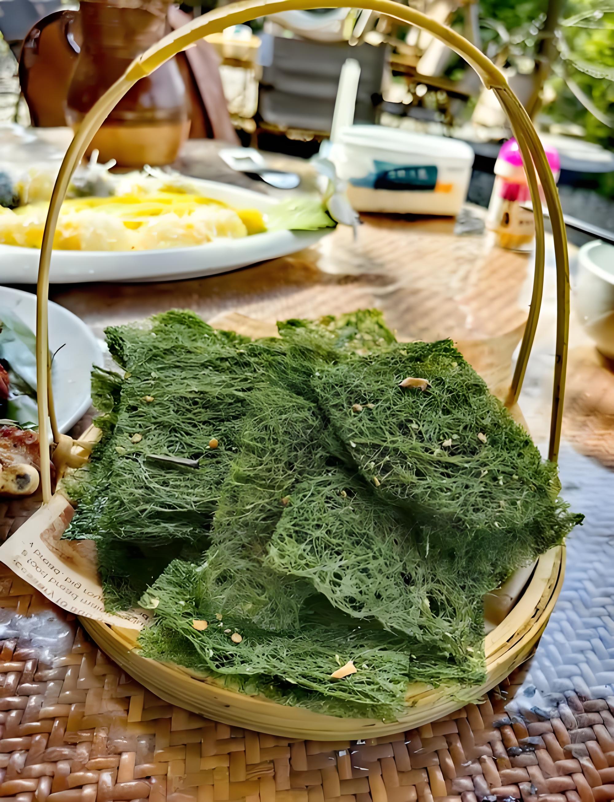 基诺炸青苔是基诺特色风味小吃,基诺青苔取自山涧溪流,干净鲜嫩、风味独特。 炸青苔配以基诺特制的椒盐,添加香茅草、蒜等各种配料炸制而成,吃时其味酥脆鲜香。炸制时须将青苔彻底烘干,便于炸制酥脆,亦便于保留山野本味。