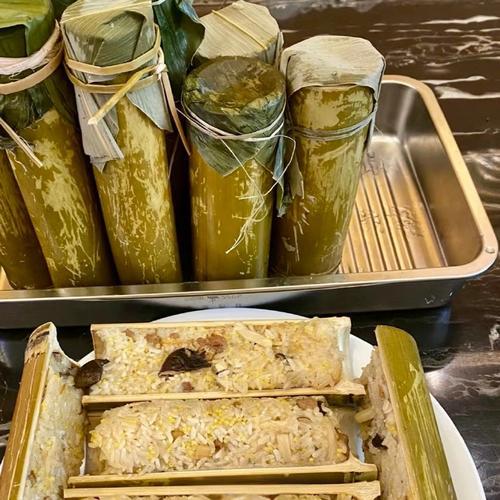 竹筒饭是基诺族与自然共生的饮食智慧,以新鲜香竹为器,填入糯米与食材,经炭火烤制,竹子的清香完全融入米饭,软糯香甜、余味悠长。 无论是节庆出行还是日常待客,竹筒饭都是基诺族最具代表性的美食,是人与自然和谐共生的味觉见证。