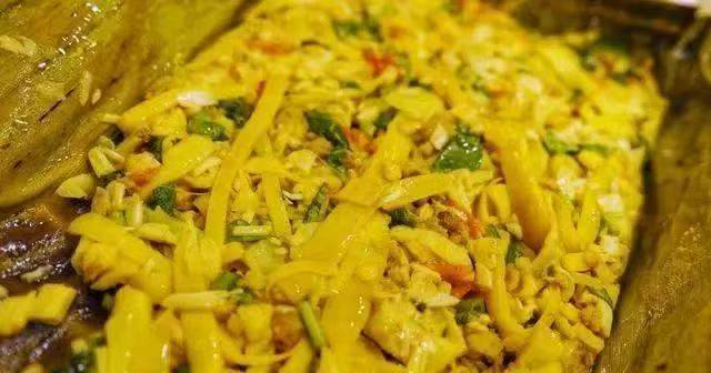 烤芭蕉花是基诺族独有的野菜美味,将新鲜芭蕉花去涩后,搭配香料炭火烤制,软糯中带着植物的清香,酸辣开胃。 这道菜是基诺族利用热带植物的智慧体现,是时令限定的山野珍馐,尽显基诺族饮食的原生态与独特性